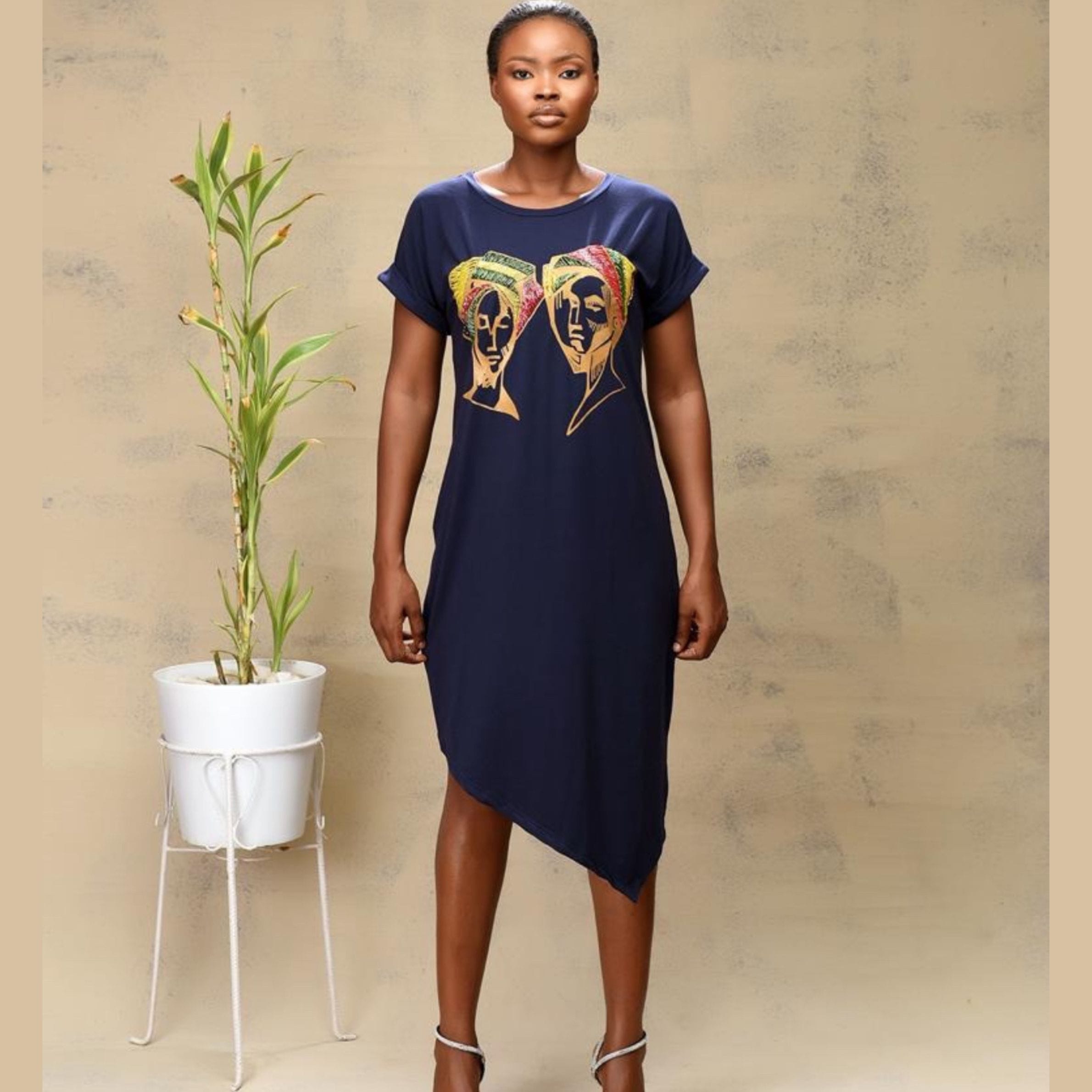 The front of the dress showcases a captivating graphic print of two stylized female faces, adorned with vibrant, colorful headwraps that evoke a sense of tradition and beauty. The deep navy blue fabric provides a sophisticated backdrop for this eye-catching design.