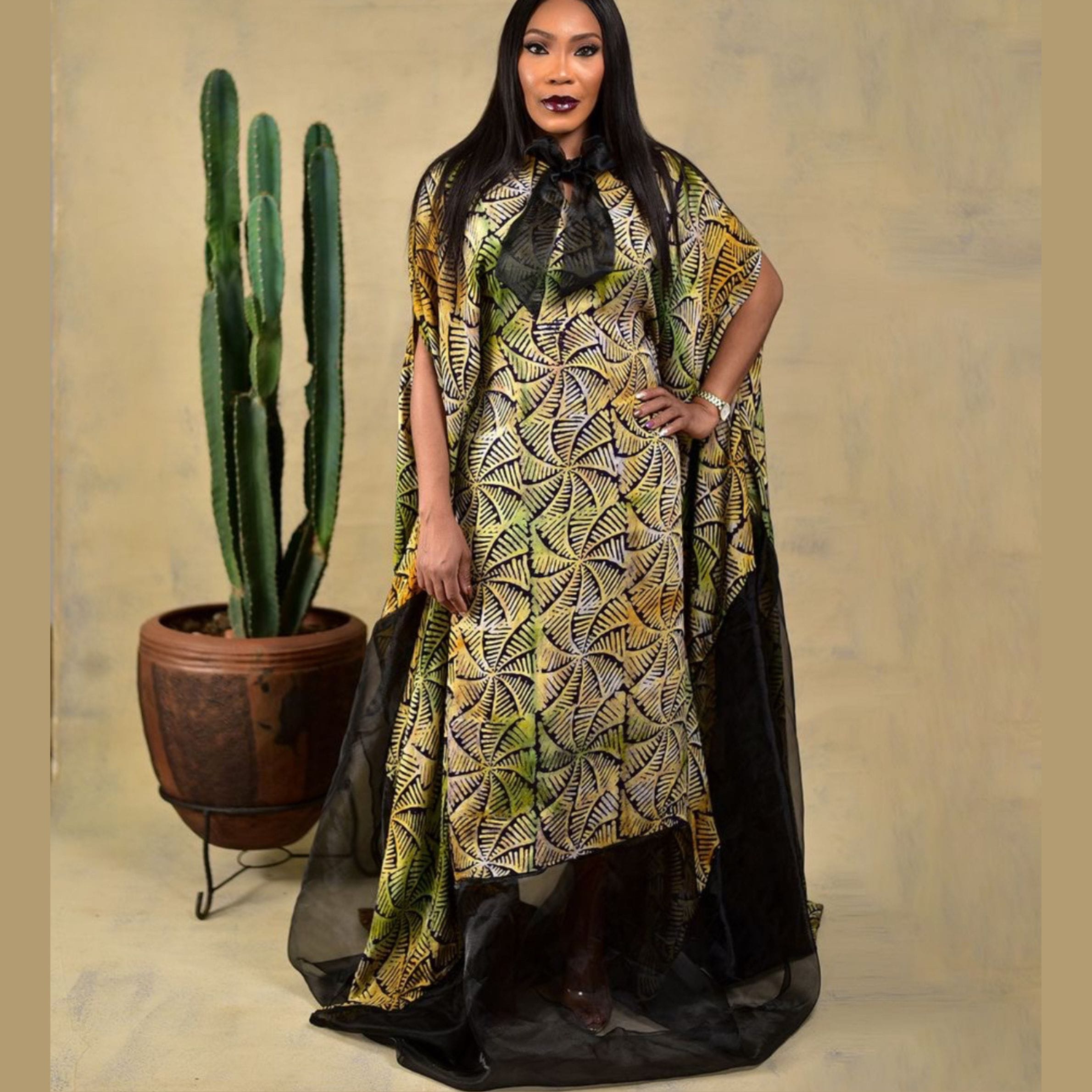 The “Yanci” gown features a captivating green, yellow, and black African print, boasting an intricate, fanned geometric pattern that exudes elegance and cultural richness. The silhouette is a stunning maxi-length gown that flows gracefully, adorned with a dramatic, integrated cape overlay. This cape billows beautifully, creating a regal and ethereal presence, extending past the main dress. The bottom of the gown and cape are finished with an elegant sheer black fabric trim, adding a touch of sophisticated allure and movement.