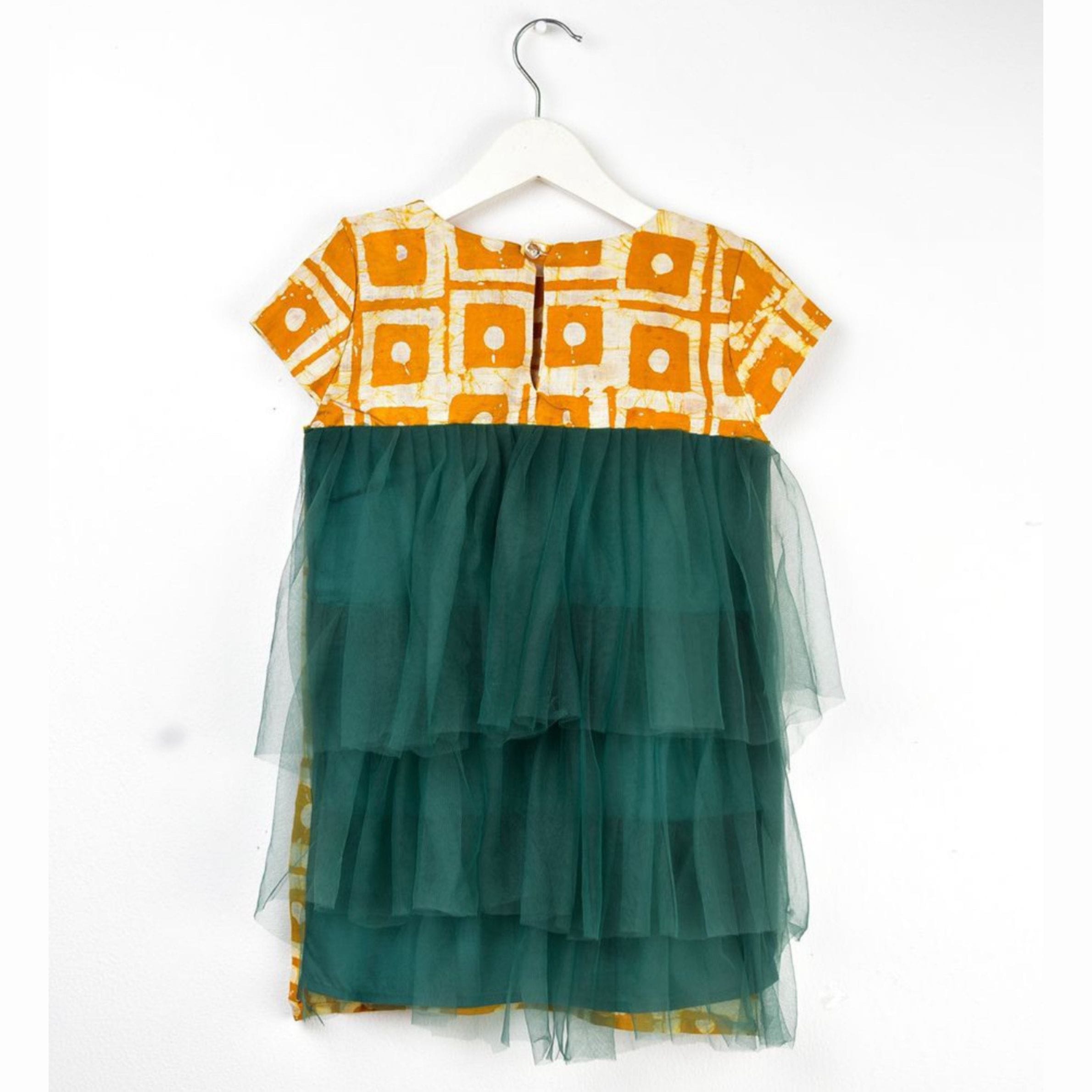 This charming dress features a striking yellow top adorned with a bold African print, showcasing the brand’s signature aesthetic. The top is perfectly complemented by a playful green tiered net skirt, adding a touch of whimsy and elegance. Made with comfort and style in mind, it’s ideal for parties, special occasions, or simply adding a splash of color to everyday wear.