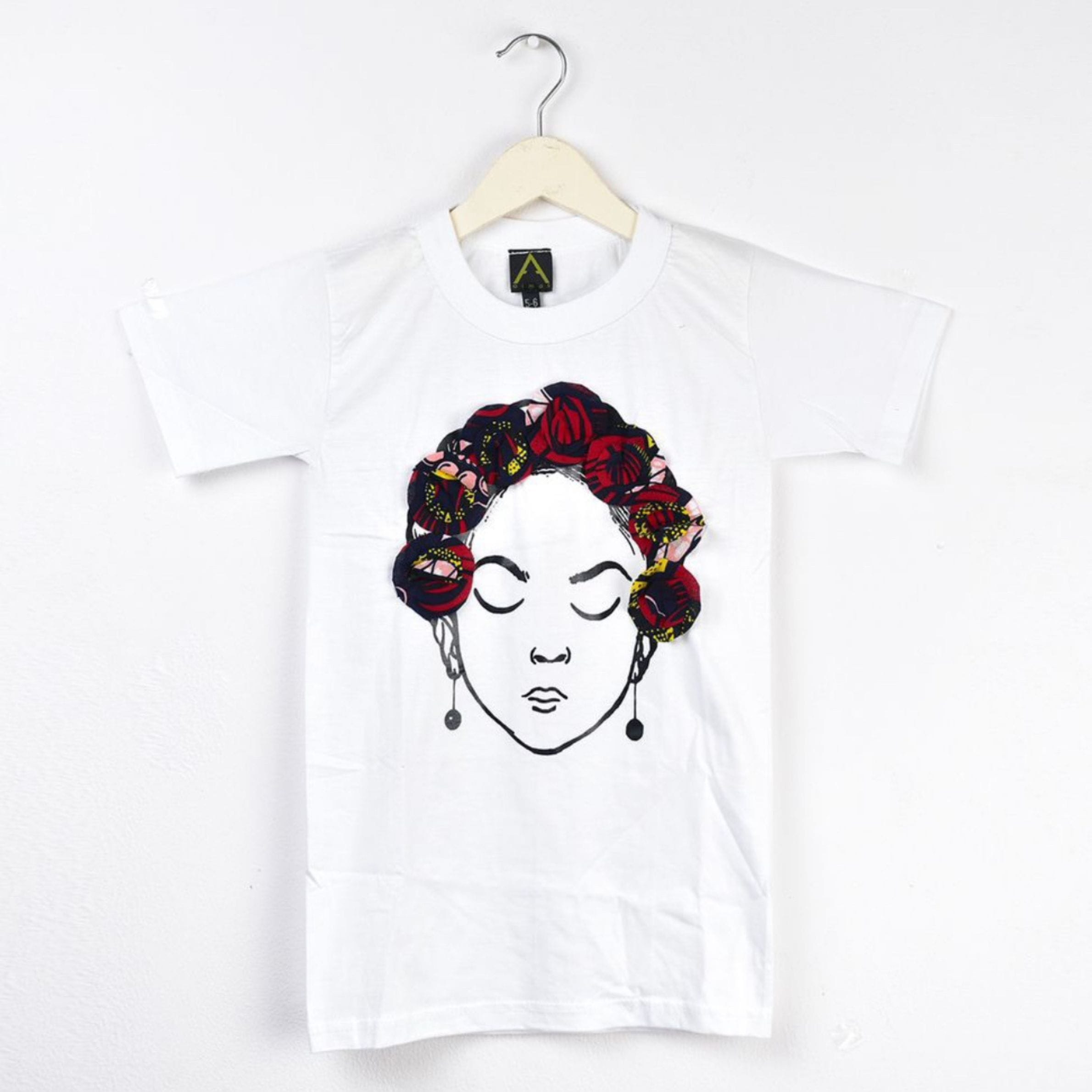 Unleash your child’s unique style with the Aima’s Kids White T-Shirt Dress, a blend of classic comfort and vibrant African artistry! This charming white t-shirt dress features a captivating graphic print of a serene face, beautifully adorned with 3D African print fabric embellishments that form a stylish headwrap and eye-catching “earrings.”
