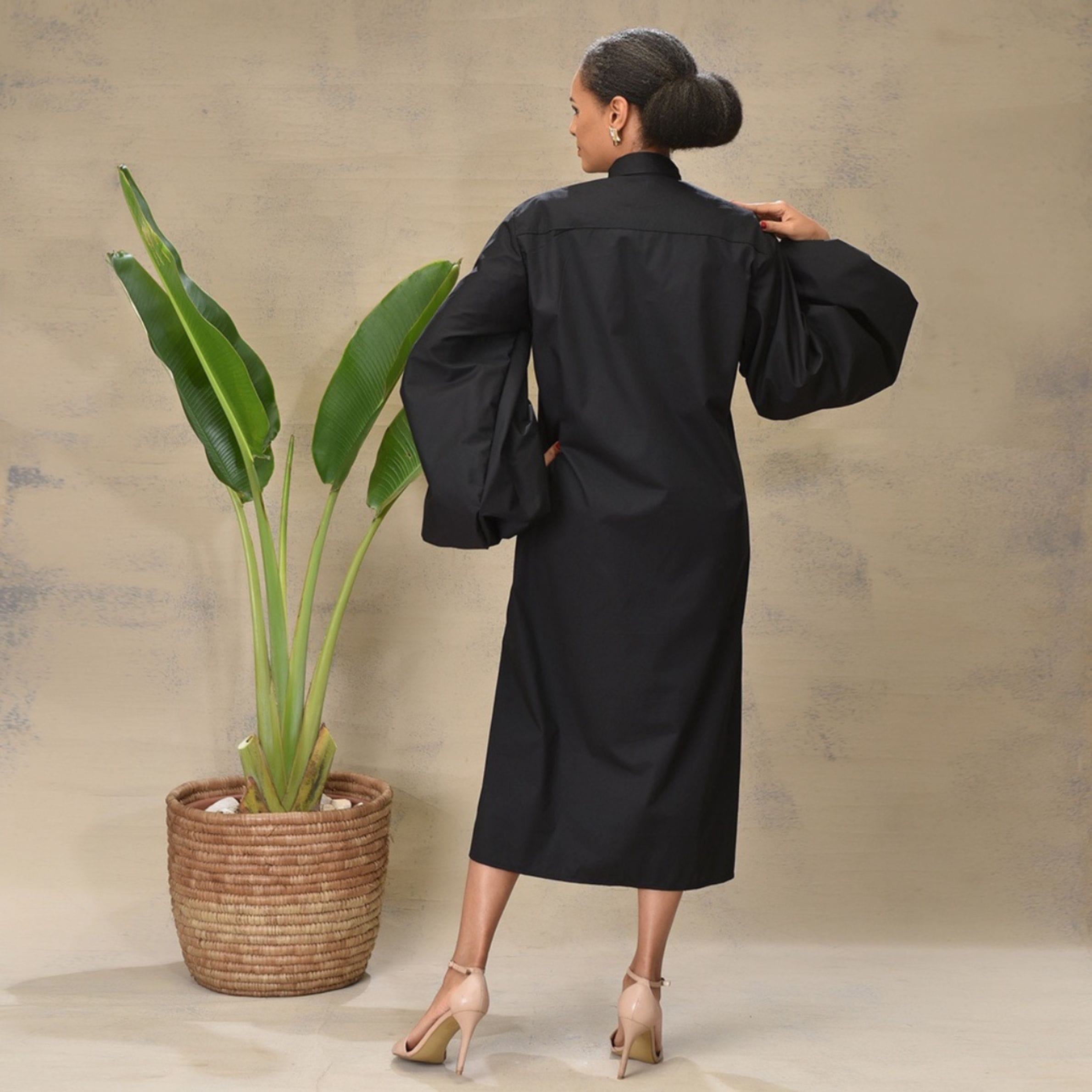 The “Khosi” dress is crafted from a sleek black fabric, providing a versatile and elegant base. It features an eye-catching white graphic print of an abstract or stylized figure on the front, adding a touch of modern artistry and intrigue. The dress boasts dramatic voluminous sleeves that gather at the cuffs, creating a contemporary and fashion-forward silhouette.