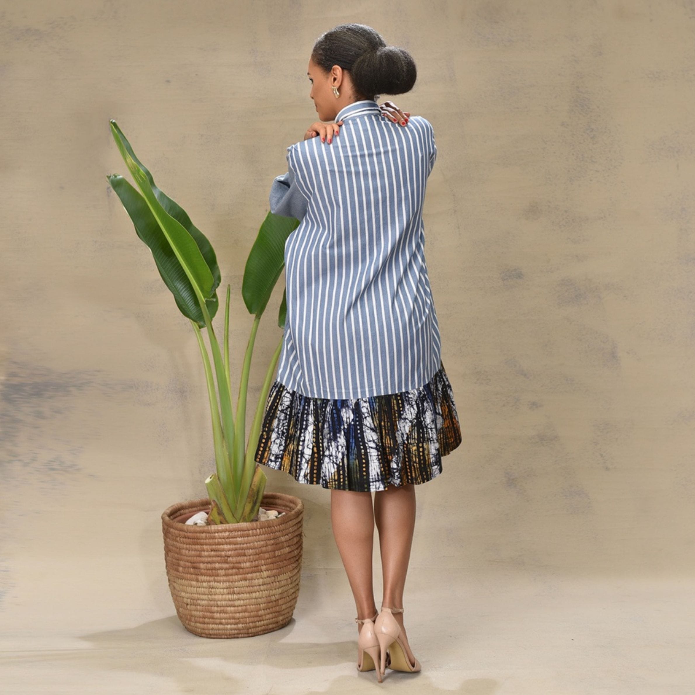Embrace unconventional style with the Aima’s Shirt Dresses “Malkia” Asymmetrical Striped & African Print Dress. This unique piece redefines the classic shirt dress, blending structured elements with vibrant patterns for a truly distinctive look.