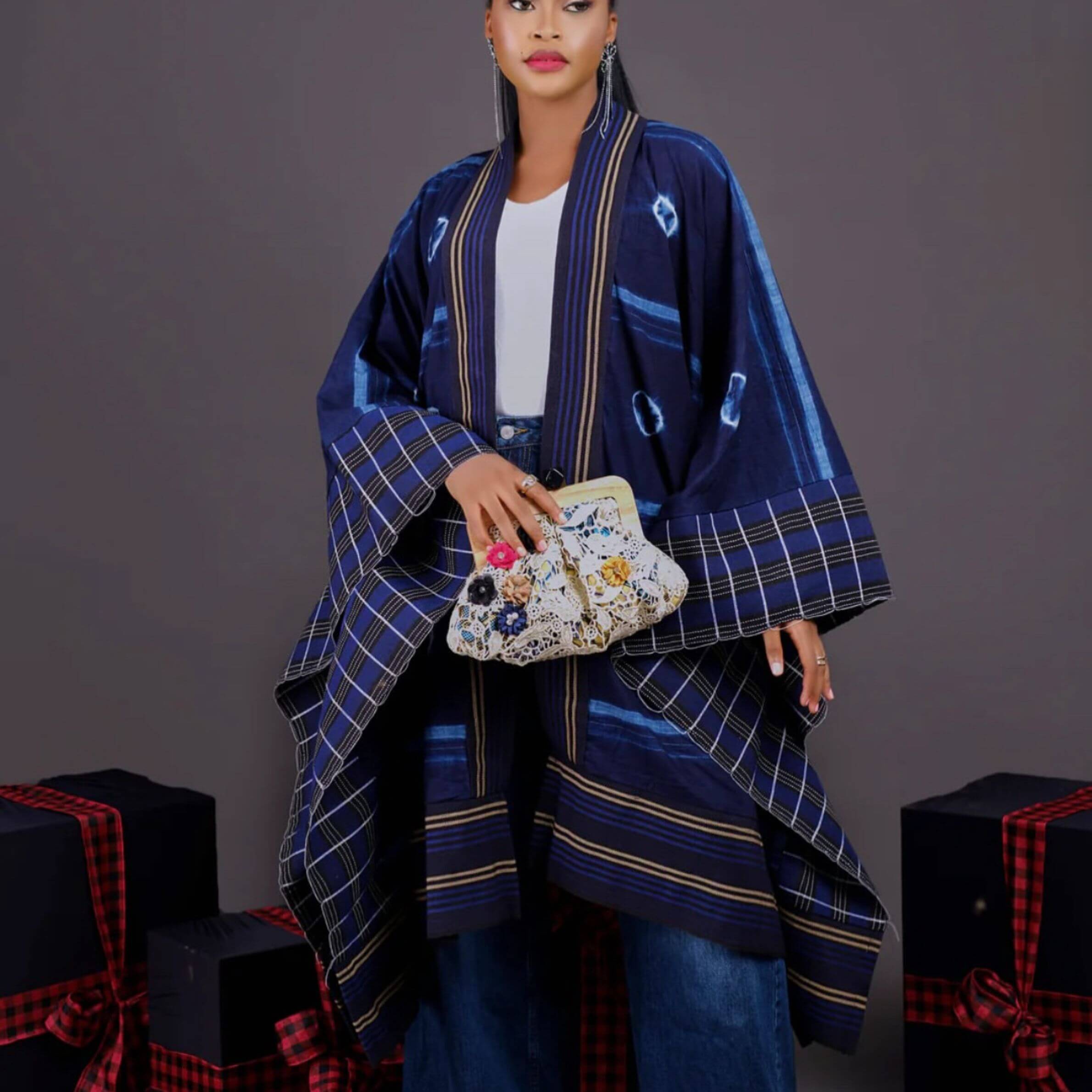 Transform your wardrobe with the exquisite DFL Rocks Aso Oke Bounded Kimono, a masterpiece of craftsmanship that embodies the rich traditions of Africa. This striking women’s kimono features the elaborate, intricate patterns characteristic of traditional Aso Oke fabric, displayed in a mesmerizing indigo and plaid design that captures the eye and stirs the imagination.