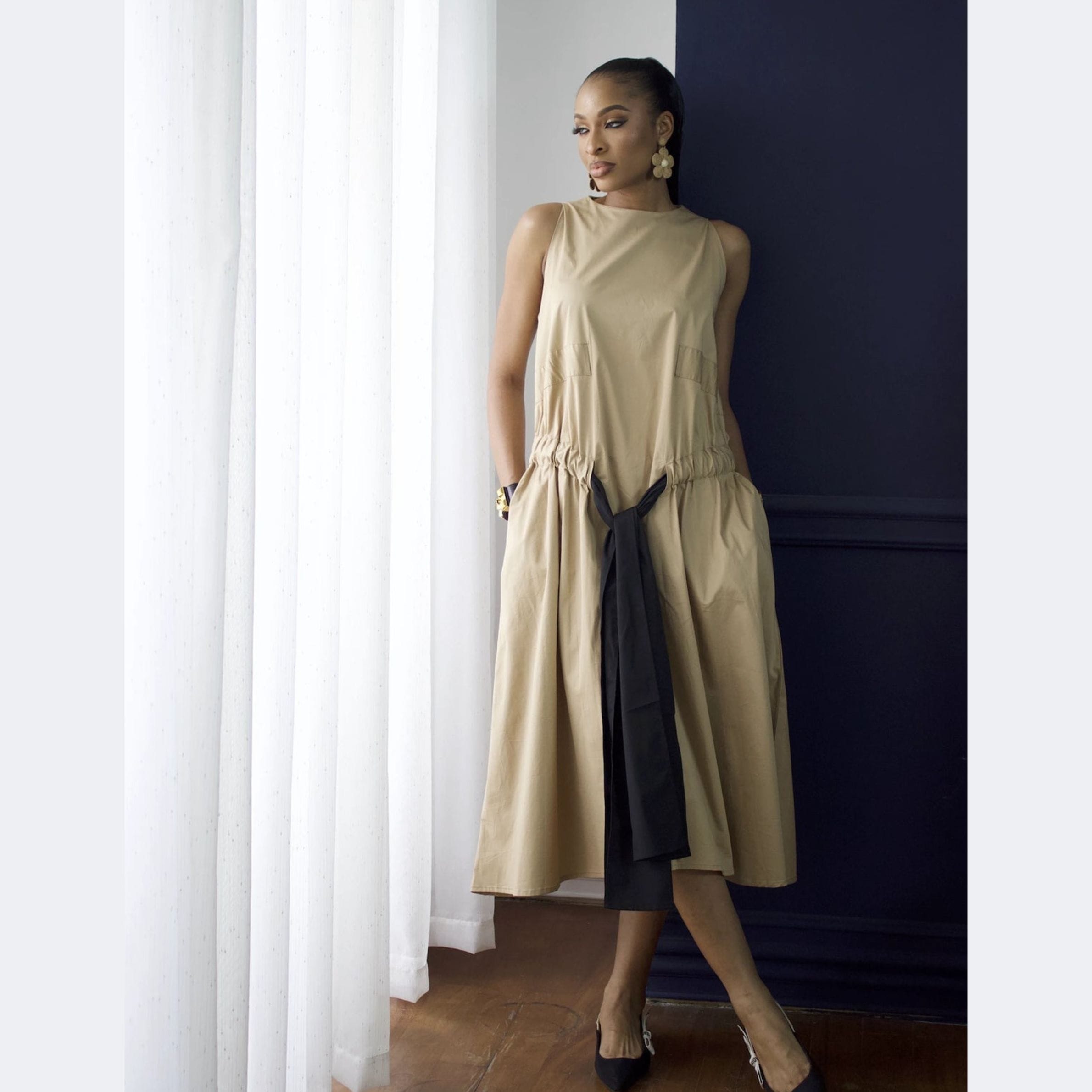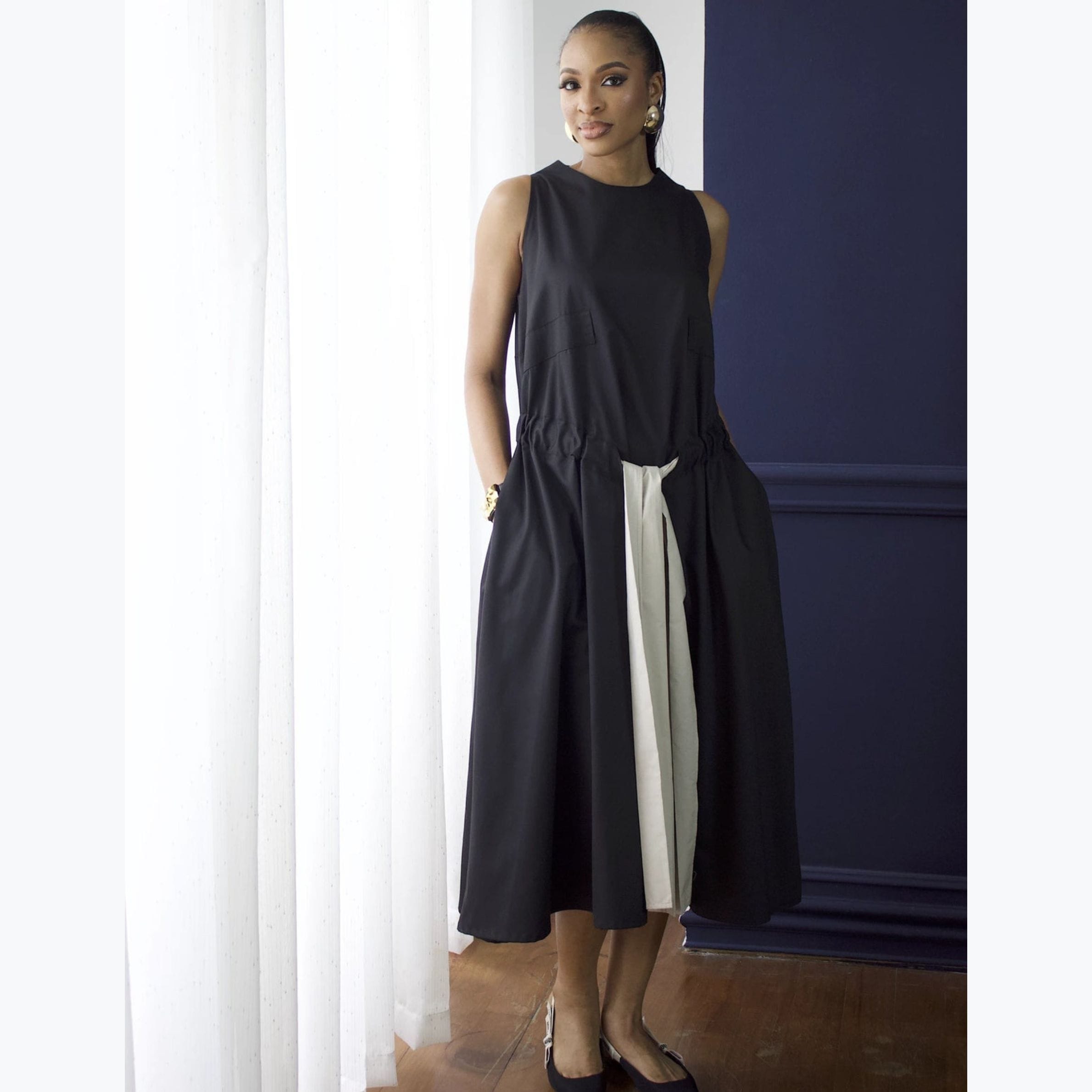 The “Onome” Midi Dress features a comfortable, sleeveless design and a gracefully flowing silhouette that drapes beautifully. Its relaxed bodice transitions into a generous skirt, cinched at the waist with a subtle drawstring or elasticated detail and accented by a stylish tie. Functional side pockets add a touch of casual elegance and practicality. The true charm lies in the unique vertical contrast panel gracing one side of the skirt, adding an unexpected visual element that defines its “enigmatic allure.”