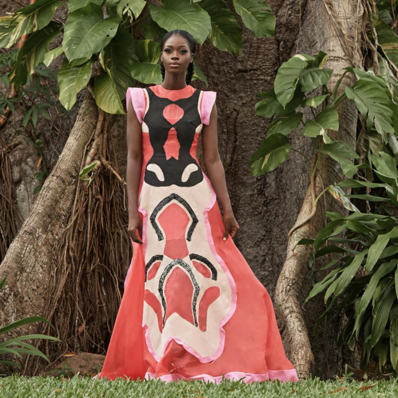 Immerse yourself in wearable art with the Odio Mimonet Haute Couture Coral & Abstract Art Gown, a breathtaking creation from one of Africa’s most visionary luxury designers.