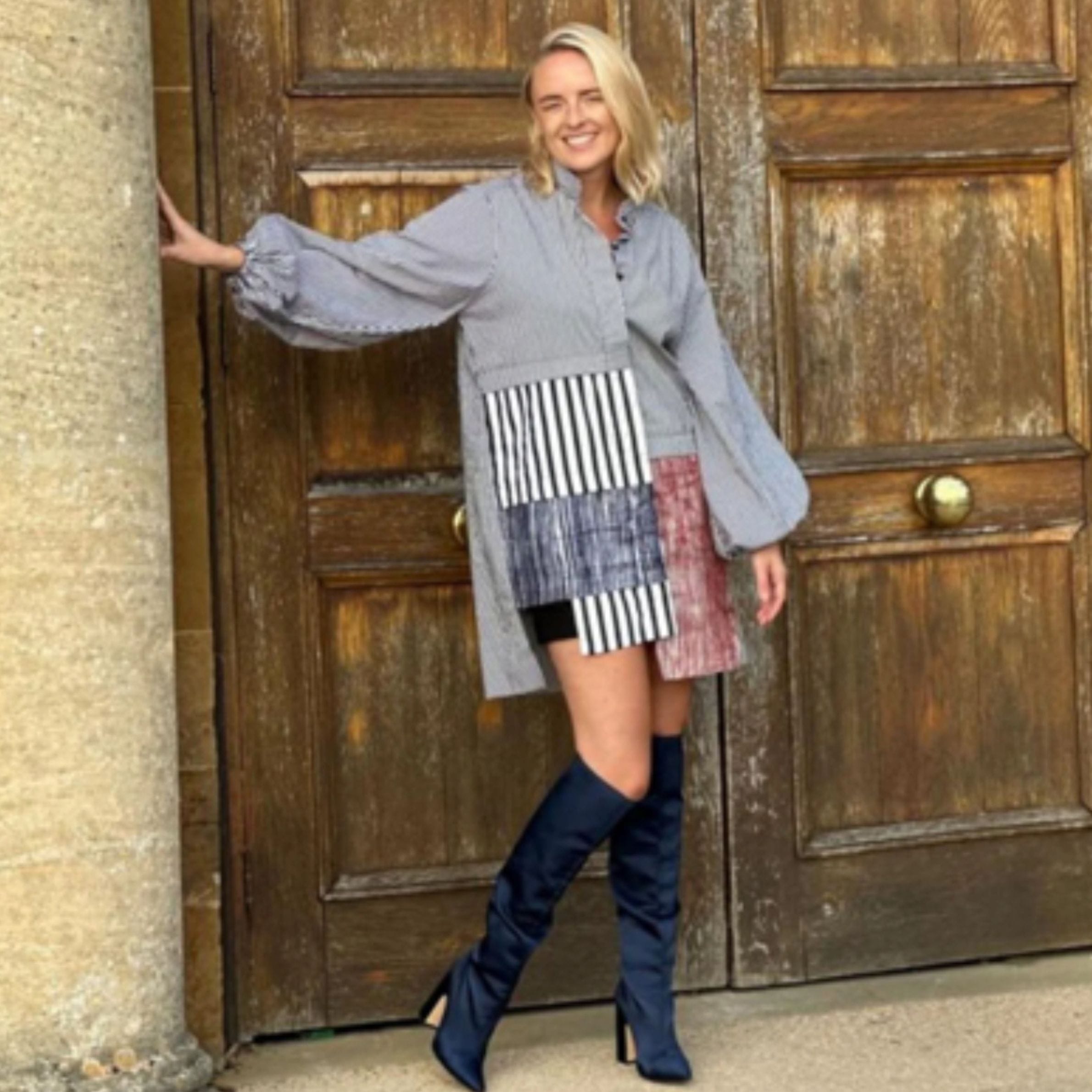 This unique piece features a sophisticated pinstripe top with dramatic balloon sleeves, perfectly complemented by an eye-catching striped and color-block patchwork detail.